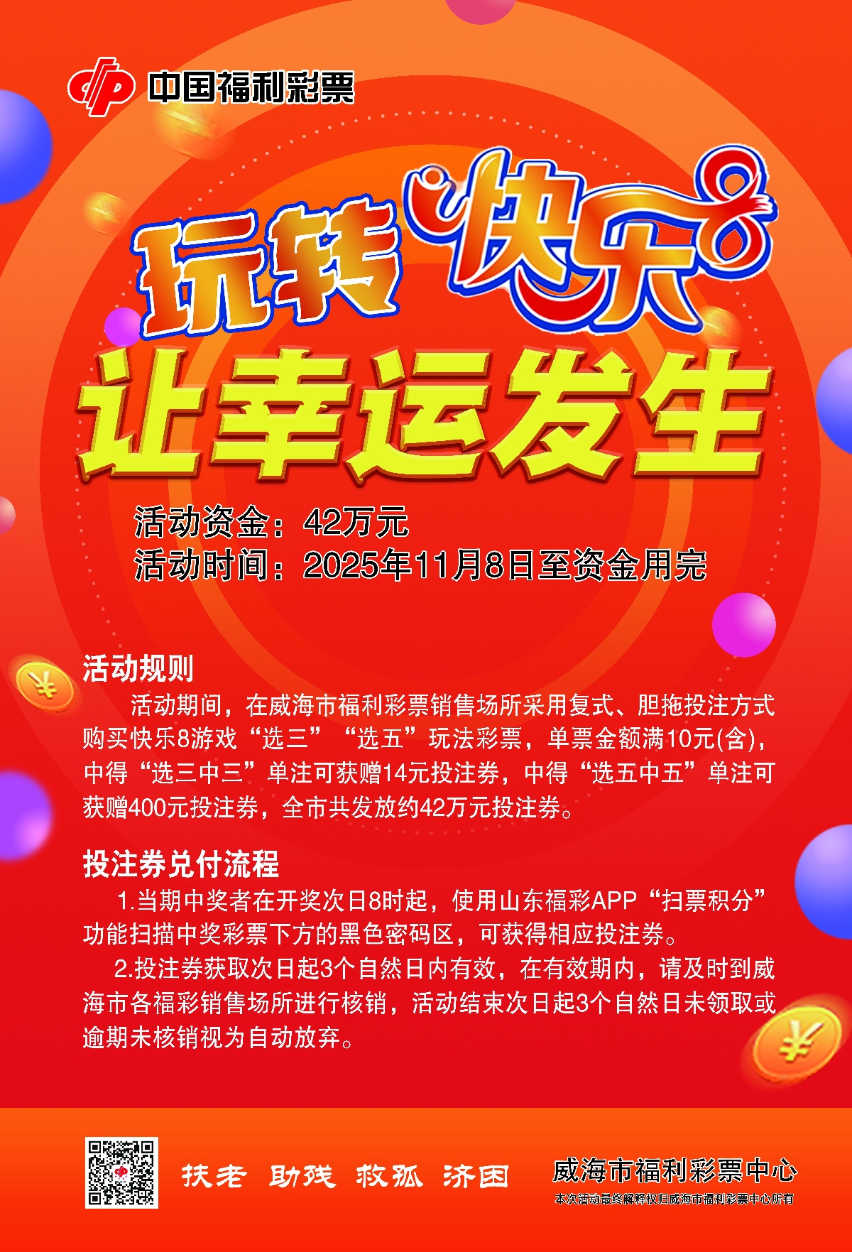 威海福彩“快樂(lè)8”營(yíng)銷(xiāo),11月8日開(kāi)啟,選三、選五玩法獎(jiǎng)上加獎(jiǎng)