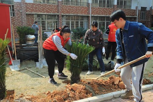 活動(dòng)中,基礎(chǔ)分公司黨員志愿者與銀山小學(xué)教職工熱情高漲,分工協(xié)作,有的松土挖坑、有的扶苗填土、有的澆水育苗,現(xiàn)場一派熱火朝天的忙碌景象。在大家的共同努力下,本次活動(dòng)共種植山茶花、鐵樹、桂花樹等樹苗60多棵。