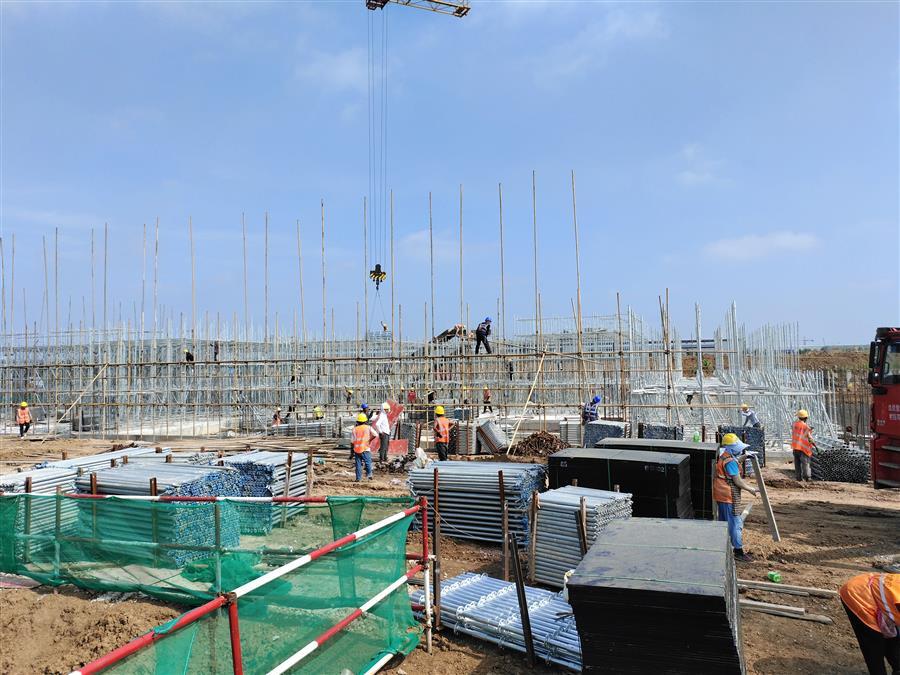 “日均投入施工技術(shù)人員500余人、各類機(jī)械設(shè)備45臺(tái)搶抓施工節(jié)點(diǎn)。”項(xiàng)目負(fù)責(zé)人禤旭云說,自6月開工以來,針對項(xiàng)目工期緊、任務(wù)重的情況,項(xiàng)目部按照“開工即攻堅(jiān)、起步即沖刺”的要求,全面推進(jìn)項(xiàng)目建設(shè)。目前,中試車間基礎(chǔ)回填、褥墊層鋪筑、墊層澆筑、剛性地面鋼筋綁扎完成;1#生產(chǎn)車間53~56軸獨(dú)基開挖基礎(chǔ)承臺(tái)鋼筋綁扎、模板安裝、砼澆筑完成,48~52軸基礎(chǔ)開挖、墊層澆筑完成;2#生產(chǎn)車間18~25軸基礎(chǔ)承臺(tái)鋼筋綁扎、模板安裝、砼澆筑完成;倉庫基礎(chǔ)梁全部完成。
