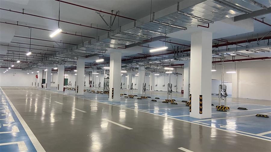 項目總建筑面積約2.7萬平方米,為一座兩層局部覆土式地上停車庫,建設內(nèi)容包含停車場、地面廣場鋪裝及綠化、給排水、電氣、消防等附屬工程。項目建成將新增600個機動車位,其中負二層510個機動車位,負一層78個有充電樁的新能源停車位,屋面12個無障礙車位;另外,停車庫屋面設有283個非機動車位。綠地率為60%。停車場內(nèi)部空間寬敞明亮,外觀看像是地下停車庫,但實際上由于該區(qū)域地勢較低,為合理規(guī)劃,特意將停車庫設計為地上兩層局部覆土式停車庫,即在停車庫上方回填泥土,在泥土上種植綠化樹木,將車庫上方裝點成一個小公園。項目交付運營,有效緩解三門江森林公園周邊“停車難”問題。