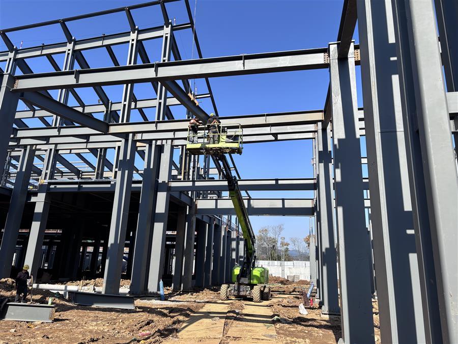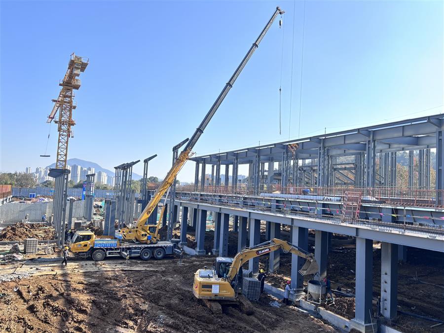 項目施工現(xiàn)場,機(jī)器轟鳴,工程車輛來回穿梭,工人們在各點(diǎn)位開展墊層、樓承板澆筑、鋼筋綁扎、栓釘焊接、基礎(chǔ)砌磚、屋面底板和鋼結(jié)構(gòu)梁柱安裝等施工作業(yè),處處涌現(xiàn)“冬忙”景象。