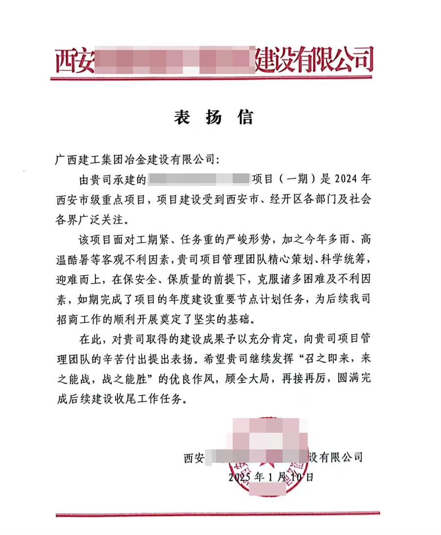 新年伊始,喜訊傳來!近日,冶建公司收到遠(yuǎn)在千里之外的項目業(yè)主寄來一封《表揚(yáng)信》,信中對冶建基礎(chǔ)分公司承建項目的管理水平高、建設(shè)速度快、工程質(zhì)量優(yōu)“點贊”,向全體項目管理人員的辛苦付出提出表揚(yáng),對公司取得的建設(shè)成果予以充分肯定。