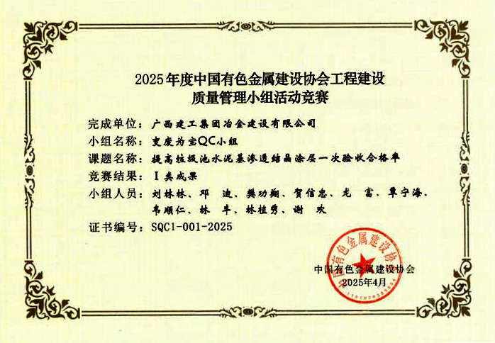 近日,中國有色金屬建設(shè)協(xié)會公布2025年度中國有色金屬協(xié)會工程建設(shè)質(zhì)量管理小組活動(dòng)競賽結(jié)果,冶建公司申報(bào)的4項(xiàng)成果中,有三項(xiàng)獲得Ⅰ類成果,一項(xiàng)獲得Ⅲ類成果。公司此次申報(bào)獲獎(jiǎng)率100%。