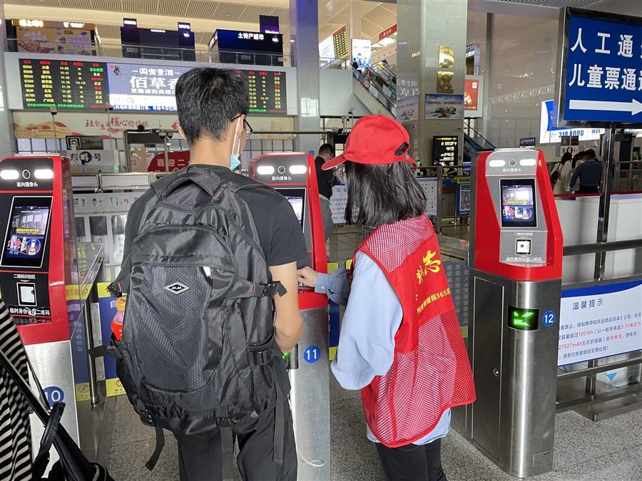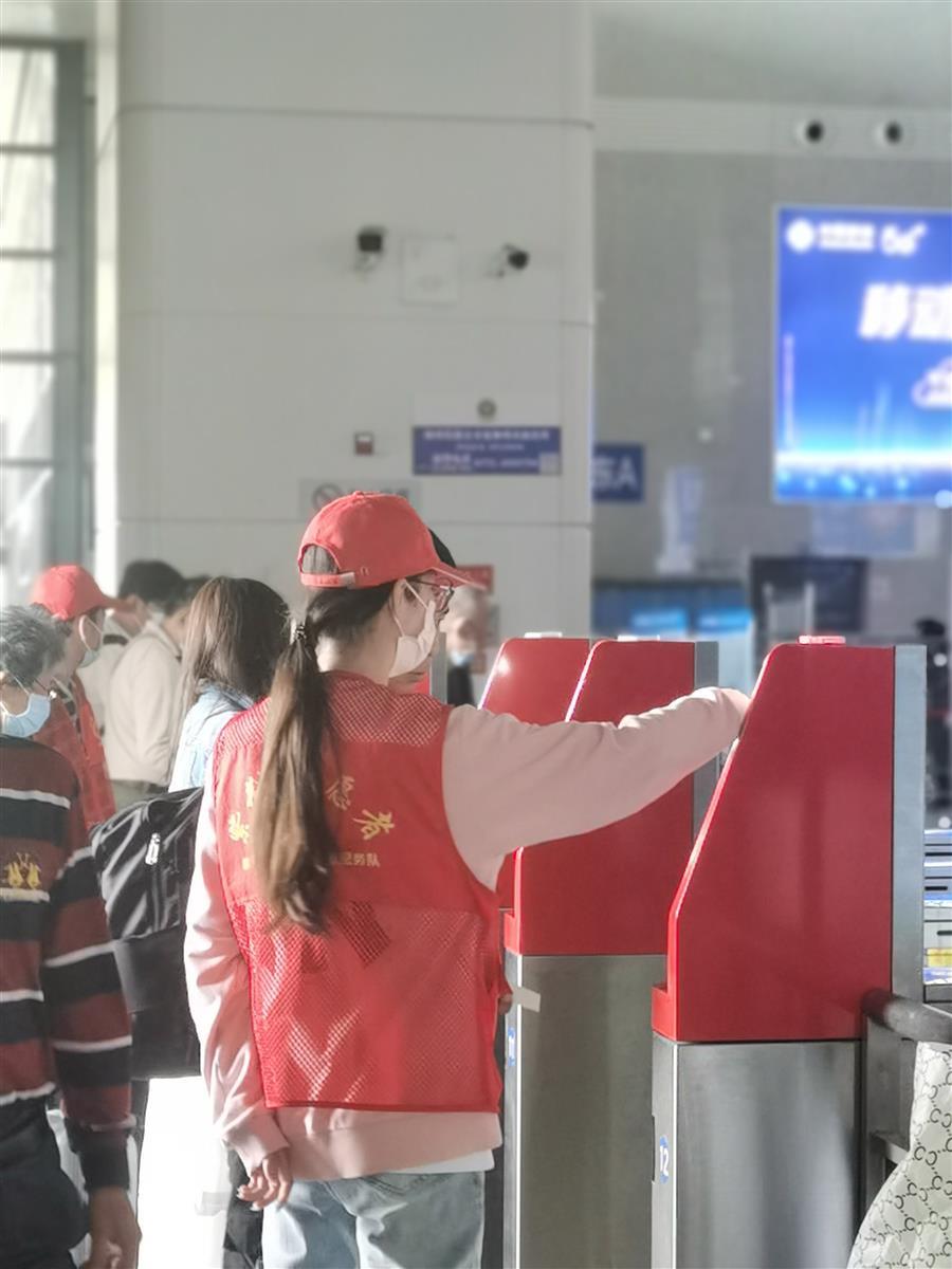 冶建志愿者們在火車站協助車站工作人員做好疫情防控工作,在進站口給乘客測體溫,核實健康碼、行程碼、核酸證明,引導乘客刷身份證進站、為進出站的乘客指路。