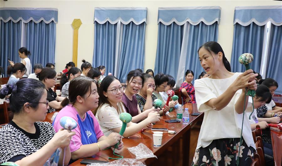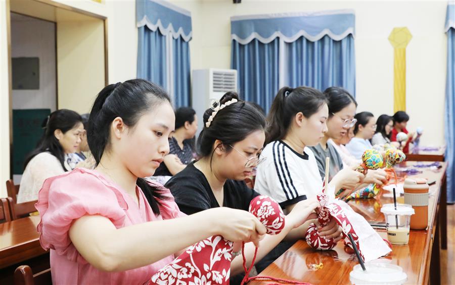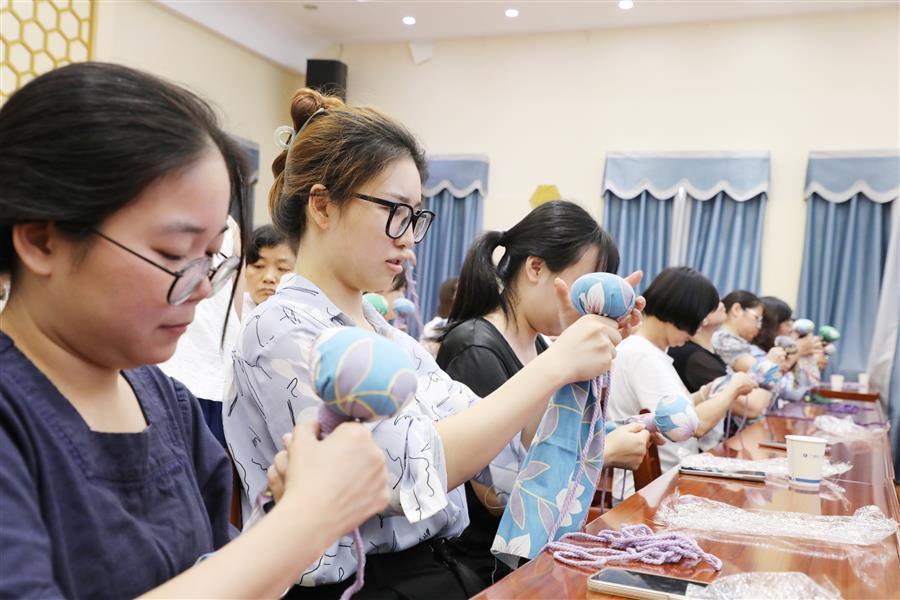 課堂上,培訓(xùn)老師王春梅為大家詳細(xì)講解了艾草養(yǎng)生錘的功效和用途,并演示了其制作方法和步驟。“將錘柄插入艾草包,拉緊艾草包,然后將其放在布料三分之一處,捏成一個(gè)緊實(shí)的圓球……”在王老師的指導(dǎo)下,女職工們積極參與,跟著老師的指導(dǎo)一步一步地制作自己的養(yǎng)生艾草錘。大家認(rèn)真細(xì)致的聽(tīng)講并按步驟制作,不久一把把色彩鮮艷、質(zhì)量上乘的艾草養(yǎng)生錘相繼“出爐”。大家互相試用,現(xiàn)場(chǎng)洋溢著歡聲笑語(yǔ)。